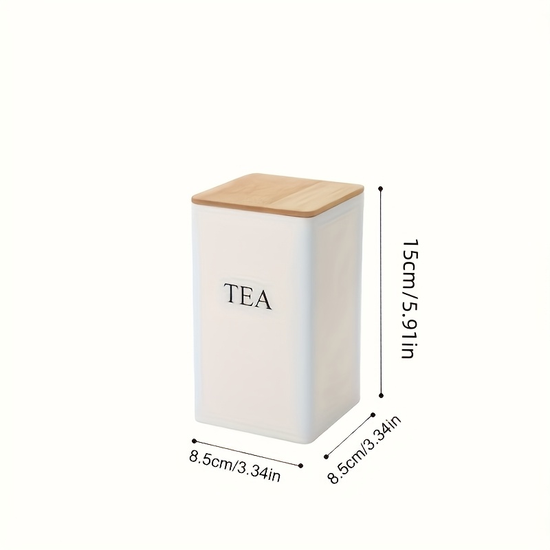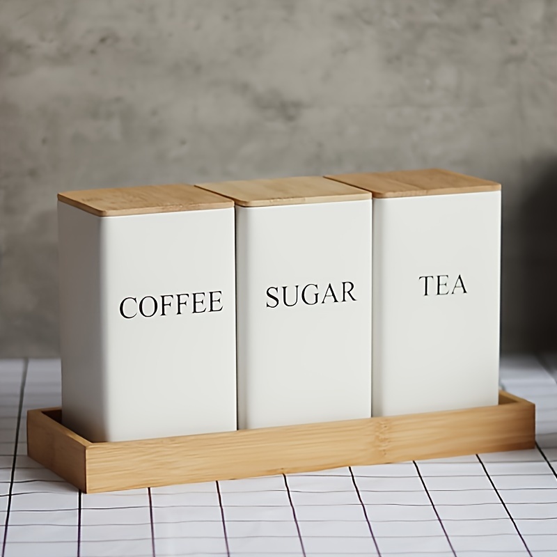 Set of 3 Cast Iron Kitchen Canisters with Wooden Lids - Engraved Label Storage Containers for Tea, Coffee, Sugar - Washable and Uncharged Metal Dispensers for Office and Dining, White Metal